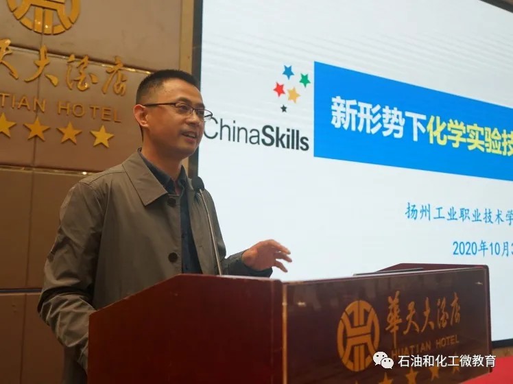 高職化學(xué)實(shí)驗(yàn)技術(shù)賽項(xiàng)專家組成員、揚(yáng)州工業(yè)職業(yè)技術(shù)學(xué)院化工工程學(xué)院院長錢琛作《全國職業(yè)院校技能大賽改革試點(diǎn)賽化工類賽項(xiàng)(高職)規(guī)程與理念》報告。